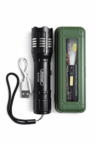 High-power rechargeable LED torch with COB work light strip and USB charging cable. Supplied in protective green case.